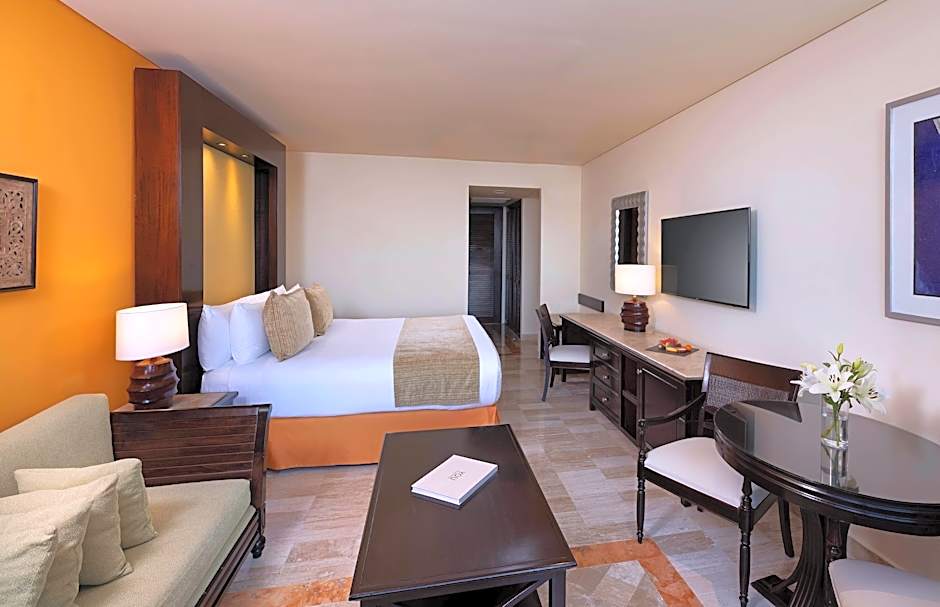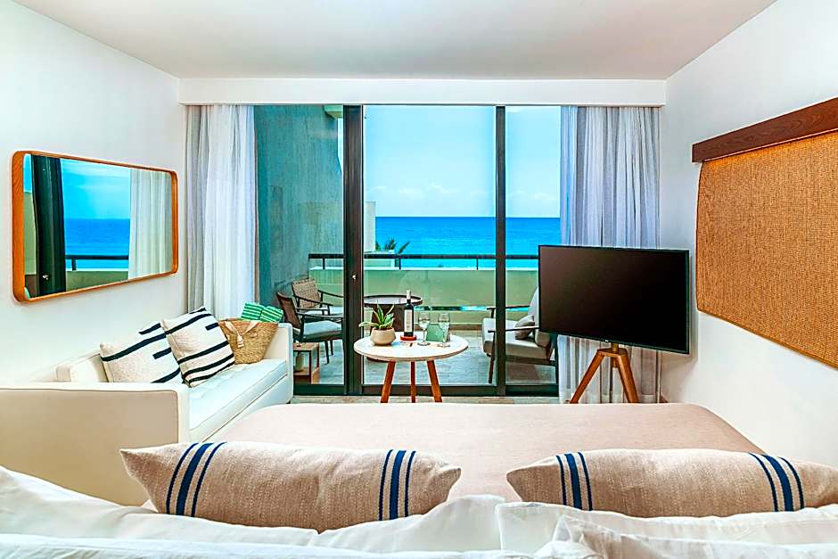 This spacious junior suite features designer furniture, a private terrace with views of the Nichupté Lagoon. Plus luxury amenities are available.